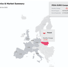 瑞士分析机构Pexapark数据显示,9月欧洲共签署19份总计630MW电力购买协议(PPA),但大部分主要市场PPA价格环比下跌,波兰市场降幅最大。