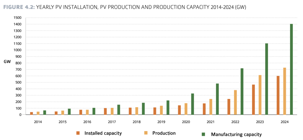 根据IEA-PVPS发布的《2025年光伏应用趋势报告》(Trends in PV Applications 2025),2024年全球光伏新增装机量、组件产量和制造产能均创历史新高。报告指出,去年全球新增装机量在553GW至601GW之间,累计装机总量突破2260GW。
