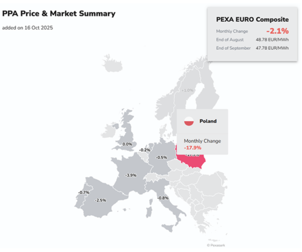 Pexapark的最新分析指出,截至9月底,追踪到的PPA平均价格为47.80欧元/MWh(约合55.53美元/MWh),环比下降2%。