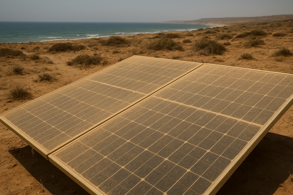 试验在沙特波斯湾沿岸城市朱拜勒进行。试验使用一块20W多晶硅组件,测试期间为2025年9月9日至9月29日。粉尘沉积密度从1.0 g/m²递增至约7.0 g/m²,分别记录每阶段的性能变化。