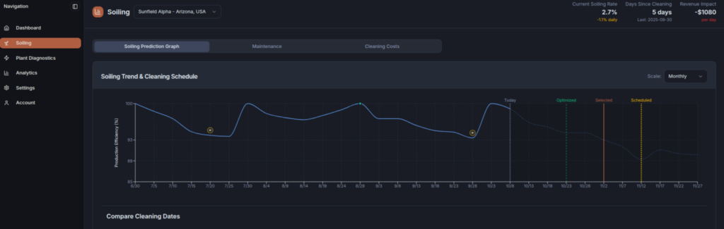 该平台使用户能够可视化不同清洗周期带来的影响,对比清洗成本与恢复电量的价值,并确定最佳清洗时机。平台会以美元持续累计性能提升和积灰损失数据,既可部署在单个电站,也可用于大型资产组合。